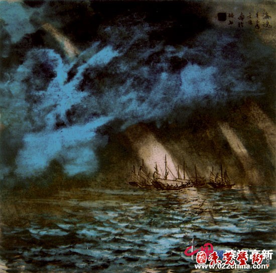 [蔡金顺]:《海魂》这幅画对我来说是比较特别的,这不是我一挥而就的,也不是用几天的时间来完成的,而是经历了几年才完成。我从天津工艺美院毕业留校后,被派到新港进行三个月的宣传工作,经过长时间的观察大海,经历了海上的各种天气,想到渔船出海的万般艰难,我就想要画一个渔船在海上遇到困难的时候的场景,表现船员们的忙碌和天气的喜怒无常,而在乌云密布中,还有几缕阳光从云缝中透过来,照在了随着波浪起伏的船上,突出了主题。可画完了这幅画之后,我感觉不是十分满意,就放到一边没有再去画;过了几年,我又想起来了这幅画,经过了缜密的思考,才把画完成了。我觉得这幅画把中西的画风有机的结合起来了,看着像水粉,但实际上不是,这幅画始终没有离开传统笔和墨的运用,虽然海浪中有一些水粉的颜色,但总体上还是国画的颜色。更确切地说,这幅画是一幅传统的中国画!