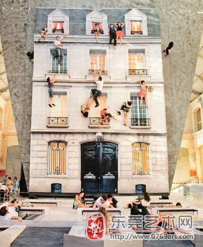 而布宜诺斯艾利斯南部的空气中也存在某种奇怪的东西,因为我还见到了阿根廷艺术家莱安德罗·埃利希(Leandro Erlich)疯狂的、像镜子一样的装置作品“Batiment Mirrored”,它具有和一幢三层楼的建筑物一样的尺寸。观众们只需要安全地躺在事先布置好了的地面上,一面巨大的镜子就会让他们看起来像是被强力的胶水挂在了建筑上一样。