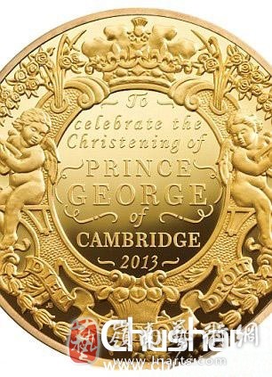 英国威廉王子和凯特王妃的儿子乔治的洗礼将于10月23日在皇家教堂圣詹姆斯宫举行。他们已经批准在英国首次铸造王室洗礼金币。这款金币上有用莉莉字体书写的祝词和两个手拿竖琴演奏的小天使,硬币下面是皇家格言 “Dieu et mon droit”(意为:上帝和我的权力)。皇家造币厂博物馆主任凯文·克兰西( Kevin Clancy)讲到,该设计的意义是永恒,也是尊严的象征。