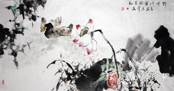 杨志伟便是当代较有影响力的花鸟画家之一,他所创作的一系列花鸟画既有传统绘画韵味又富有现代气息,含蓄隽永,清新舒展。其艺术品味情调朴实,格调典丽,色调欢快,不得不让人喜爱他笔下的自然和生灵。例如这幅《野塘水暖鸭先知》,艺术家既重视真实的视觉效果,画中野鸭粉荷栩栩如生,呼之欲出,创作又注重真善美的传达,强调其深刻的怡情作用。艺术家通过花鸟画的创作,以画喻人,以画寄情,影响观者的志趣、情操与精神生活,表达了其内在的思想与追求。