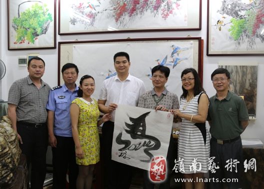 韦政岳秘书长在桂林象山区委常委、统战部长隆斌(右一)陪同下接受文超老师赠送的作品