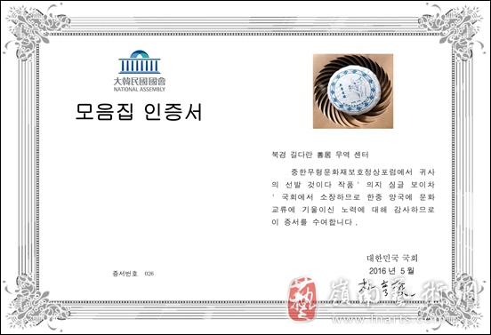 大韩民国国会朴亨埈秘书长亲笔签署的收藏证书