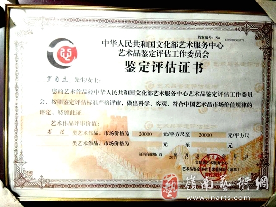 文化部艺术品鉴定评估工作委员会鉴定评估证书