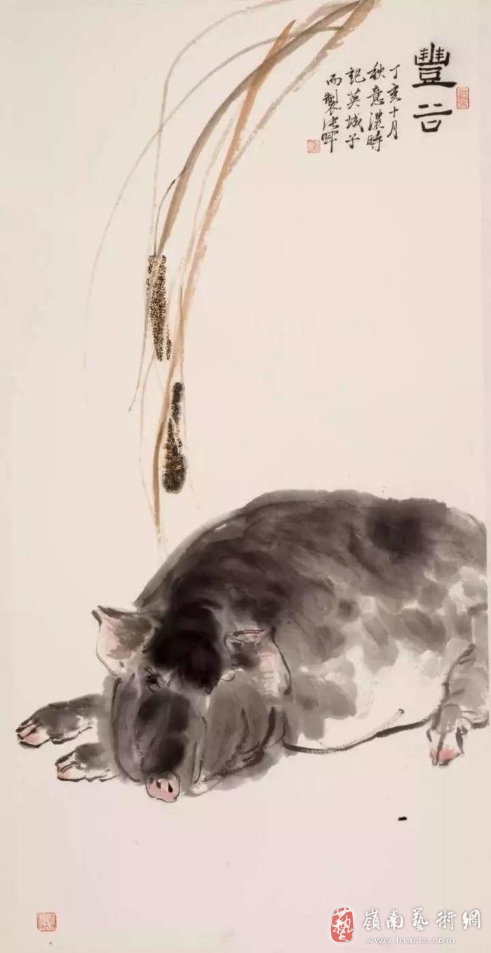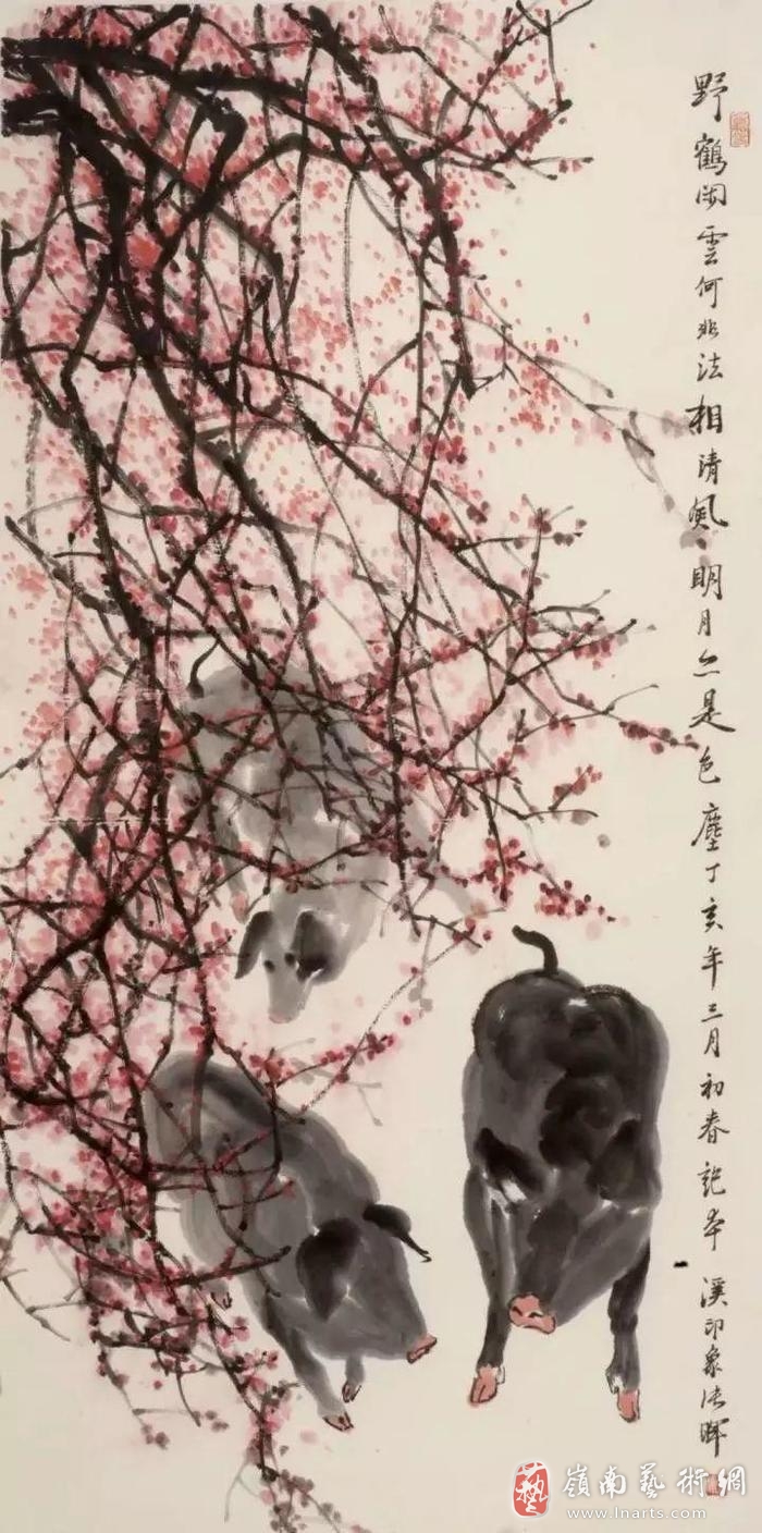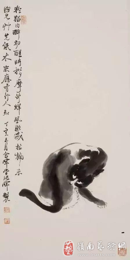 另外,张教授的水墨画里有猫、猴子、猪、鸟、牛等动物。这些动物的动作充满了真实感,牢牢抓住了欣赏者的心。特别是眼神的描绘,看似慵懒惬意的描绘,却把猫咪“初醒”的特征鲜明地表达了出来。另外,画中复数登场的动物,它们相互之间的互动姿态神情惟妙惟肖,动物们的活泼生气和嬉戏顽皮时的欢快情感直击内心。