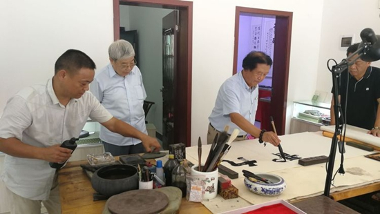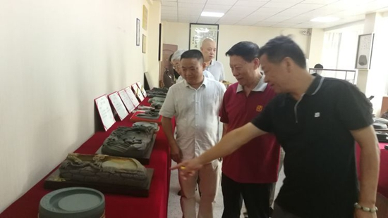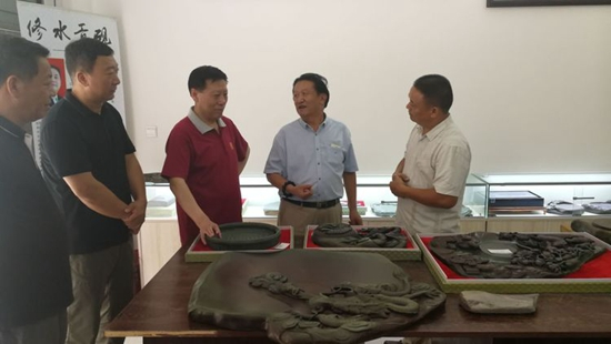 2018年9月22日,中华炎黄文化研究会砚文化委员会名誉会长刘红军,常务副会长、中国工艺美术大师刘克唐,副会长、中国工艺美术大师石飚,《中华砚文化汇典》编撰委员会副主任关键,荣誉会长王习则、荣誉副会长刘欣欣、外联部长阴巍等一行8人,应邀到江西九江修水县考察修水赭砚。期间,参观了江西省非遗代表性传承人王令老师的作品和高小兵的砚厂,召开座谈会共同分析修水赭砚的现状,商讨发展对策,并就《中华砚文化汇典》之《修水赭砚》的修改完善进行研究探讨。修水县委宣传部部长袁汝琴,文联主席荣年生,文广新局局长陈拥军、原局长戴嵩青、副局长罗贤华等领导陪同考察、参加座谈会。