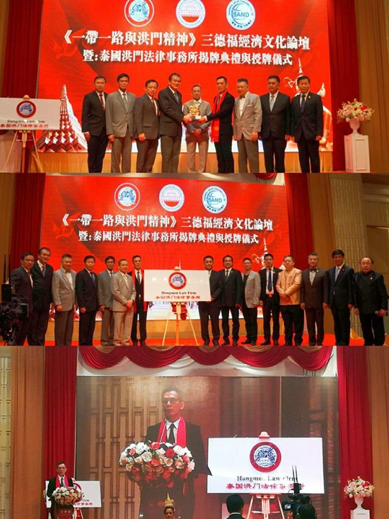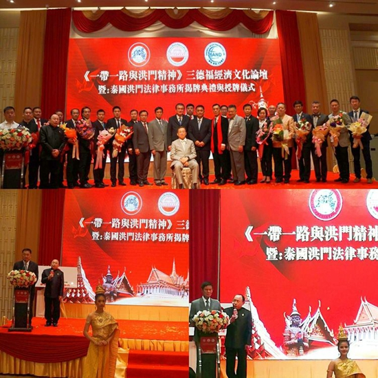 2019年1月9日,由国际华文媒体联合会、美国捷迅国际传媒、英国卫报、国际日报、欧洲新闻网、美国龙视华人频道、环球周报、《一带一路》杂志、台湾导报等十几个国家媒体代表团记者从世界各地飞抵泰国曼谷中华总商会,参加“一带一路与洪门精神”经济文化论坛暨泰国洪门法律事务所揭牌典礼及授牌仪式。