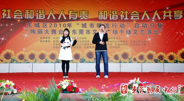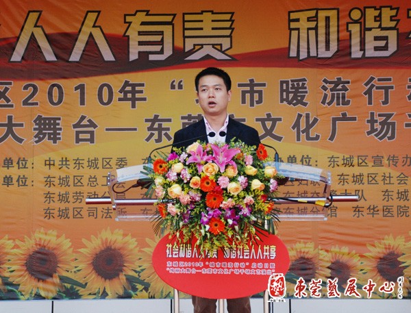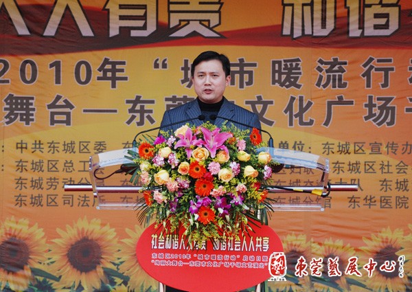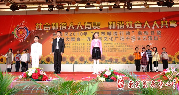 1月16日下午,东城区2010年“城市暖流行动”启动仪式在东城同沙科技工业园彩怡广场隆重举行。东莞市文明办副主任王培琦、市文广新局副局长黎寿康、中共东城区委副书记袁国超、东城区委员委员徐建文、东城区宣教办主任、区党政办副主任张小凯、东城区团委书记余雪扳、区文化服务中心常务副主任康健以及来自东城各社区、企业的居民、新莞人近2000人参加了启动仪式。