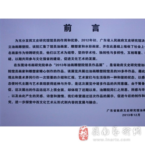 在东莞诗书画研究院举办“2013年油画雕塑院馆员作品展”,是省政府文史研究馆油画雕塑院馆员画家和雕塑家精心创作的作品。籍此向广大观众和美术界同行作一次简要的介绍和汇报。艺术家们与生活保持一种和谐的状态,以感性的形态使时代主题与艺术表现获得延伸与升华,是这次展览中诸多作品的共同意蕴。我们希望通过这次作品的展示,促进今后的创作和理论研究,进一步探索中西文化艺术从形式到内容的发展与融合。