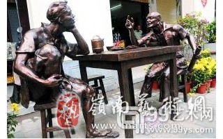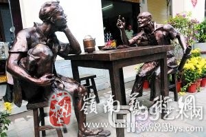 在雕塑《老爸茶》里,主角是一老一少,老人高举手臂,生动地讲述,后生以手托腮,专心地倾听。