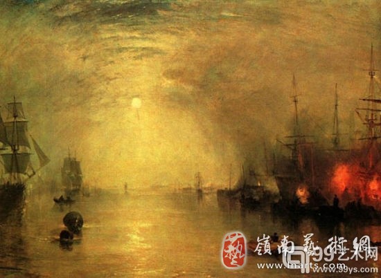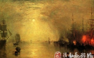 月色、轮船、月色下的帆影、煤港都在光色变幻莫测的朦胧感内飘忽可见,月色暖黄的光映照在水面,画中的点点灯火和忙碌中卸货搬运的人们,笼罩在这茫茫烟霭之中的景致都是画家对大自然和人类工业的发现与印象。更有人说有了透纳伦敦才有了雾,足见其对光影表现得淋漓尽致。而他将工业形象的轮船与码头融入大自然的风景之中也开一代风景画的先例,这种人与自然的巧妙融合,亦是特纳对绘画内涵的深度挖掘,而非仅仅对大自然的观察重现,非单一的风景与情绪的表现。透纳成功地将风景画与历史画、肖像画摆到了同等的地位,不像梵高等画家,至死才成名,幸运的透纳在早期就在画坛享有着较高声誉。