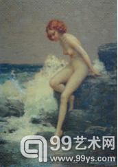 第一幅是约瑟夫·坦马尼克的作品——《喜欢海的女孩》,作者是美国著名的油画家。他生于1889年捷克的Stranice,于1974年辞世,其擅长人物、静物和宗教画。据1929年第六期出的“调色板与画架”杂志介绍,坦马尼克早年就展现出艺术天赋,他用桃木自制小提琴并在布拉格艺术设计院学习各项艺术。为逃避欧洲战火,他移民美国并成为印第安纳州和伊利诺斯州较为活跃的艺术家。其作品《喜欢海的女孩》是坦马尼克的代表作之一,画家用印象派外光画手法追求光影变幻并运用细腻的笔触描绘女孩优美的身材,同时达到与自然界色彩浑然一体的效果。画家对女孩涉水的感受,仿佛是踩着诗人的韵律: