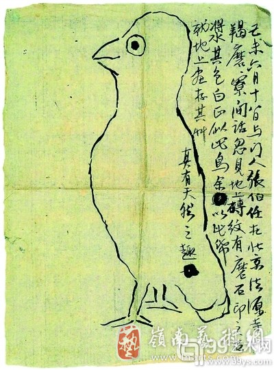 齐白石在这张纸上画了一只轮廓简略的小鸟。题跋写到:“己未六月十八日,与门人张伯任在北京法源寺羯磨寮闲话,忽见地上砖纹有磨石印之石浆,其色白,正似此鸟,余以此纸就地上画存其草。真有天然之趣。