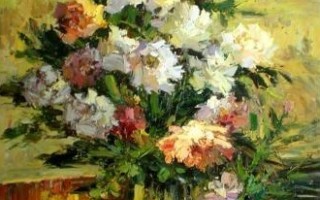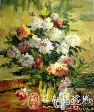 另一幅《静静绽放》,是著名画家霍明坤的作品,他是一位非常有潜力的画家。此幅画是一幅亚麻布油画,整幅画以淡雅的颜色构图,画风优美。在一个浅黄色的花瓶里,插满了绽放的花朵,淡雅迎面,簇簇美丽,这样一幅静物花卉,让观者感受到了生命的美好,没有艳丽繁荣色彩,却暗香袭人,如此静静地绽开,绝美之感,让人留连往返。