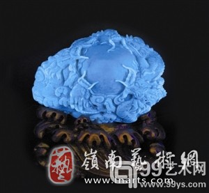 重约431.5克,是当今蓝珀界少有的极品天空蓝。双龙戏珠在日光下呈现出一抹淡幽如天际的蓝色,在荧光灯下则通体垩蓝,幽幻如碧海。此雕件是台湾著名雕刻大师由重达1.5公斤的蓝珀原石雕刻而来,费时数月,手法细腻。双龙盘旋飞舞,栩栩如生。权威珠宝评估机构的专家指出,此雕刻原料稀有、品质罕见, 加之精美绝伦的雕工,可谓难得的珍品。