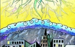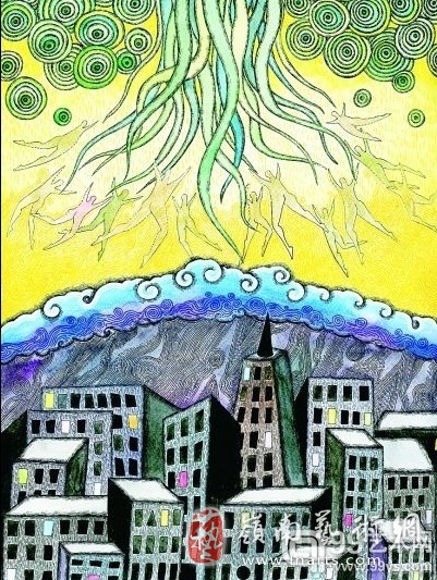 2013年的年初,雾霾先后覆盖了中国130万平方公里的土地,涉及东北、华北、西南共10个省市,空气质量急速恶化。我的作品《云上的绿色天空》以线为载体,表达着对现实社会出现巨大环境压力的思考和对美好未来的憧憬。作为对现实世界的表达,画中一半的比例关系,用到了凝重的紫黑色和急促的、连续的断线及漩涡状线条。拥挤的生活空间中找不到半点绿色,唯一的一点儿色彩从个别的窗口飘出,却被如黑洞般的点线吞没。在厚重的云层上端,是明亮的、温暖的希望之树和规律的、缓慢的、优雅的线条,人们雀跃着拥入向往的绿色天空。面对未来,在画面中自由地驰骋浪漫的想象,作品中既有对于美好未来的纵情畅想,也有对现实生活的深刻洞察。