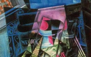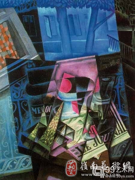 而他的作品则预示着毕加索与勃拉克两人进入综合立体主义的领域。在这一幅《窗前静物》上,可以领会到两种空间,一种是立体主义的,一种是文艺复兴时代的。这两者的结合使绘画产生了一种似是而非的实体印象。有时,格里斯也采用剪纸拼贴。大块的色彩是平面的,但从中可以感受到立体的交叠与重合,彼此穿插在一起。
