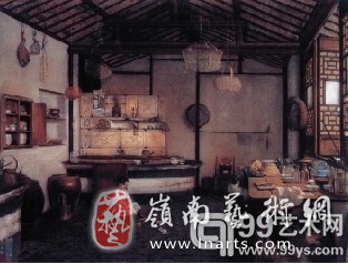 粉画的材质之美更在于它可以表现不同的题材、不同的物体,不同质感的无穷魅力,无论是轻松朦胧的画面,还是严肃凝重的主题,它都可以不负画家之意轻而易举地表达出来。例如粉画家前辈颜文樑的《厨房》,画的是一幅传统居家的厨房,那砖砌的灶头,炉膛里窜出来的火苗,锅盖上冒出的热气,墙壁上挂着的火腿,门窗的花格还透着侧射进来的阳光,一切的一切都表现得那么真切动人,让人看了犹如身临其境,仿佛还能闻到锅里肉香扑鼻而来。又如前辈李超士的静物蔬菜瓜果,画面虽然不大,通过他刻画的南瓜皮疙里疙瘩坚硬的质感,你会感觉到这是一只分量不轻的老南瓜。