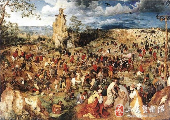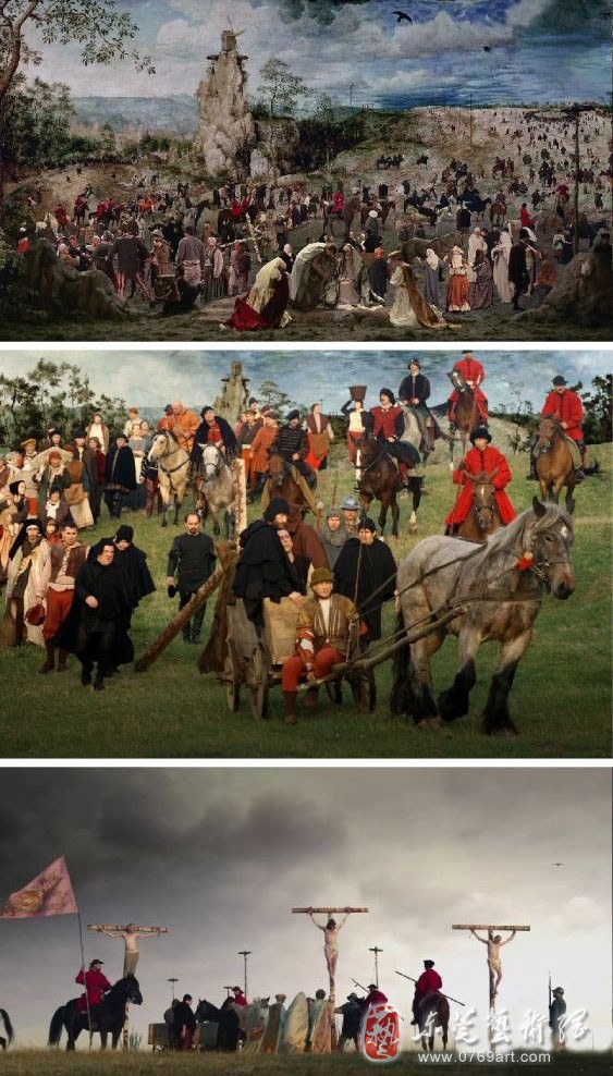 波兰电影导演莱彻·玛祖斯基(Lech Majewski)的影片《磨坊与十字架》(The Mill and the Cross)就是将16世纪尼德兰著名画家彼得•布鲁盖尔(Bruegel)的名作《受难之路》(The way of suffering,图1)进行了从绘画到电影的媒介转换。一方面,影片通过数字特技合成复原了绘画作品中的空间场景,使电影中的人物和布景如同绘画作品一样,成为活动的绘画;另一方面,整部电影的主题和情节,都在围绕着这一绘画作品中所描绘的人物、所展现的场景和所笼罩的气氛进行铺设与展开。影片不但展现了尼德兰文艺复兴时期杰出画家布鲁盖尔独特的绘画魅力,同时,也表现出了电影艺术的独特语言。