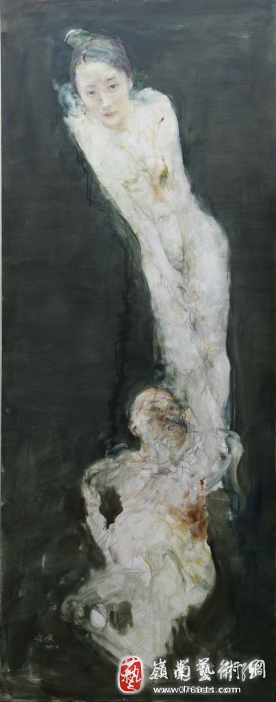 人类的“文化”概念是一种集合了各种价值观的综合体,那么在其中也必然包含了某种文化类型或文化阶段中的狭隘性和局限性,如何超越这些局限性,使艺术与纯粹的人性相连接?作为解决问题的办法之一,胡峻涤首先进行的是“自我清洗”,用一种本真的自性之光去洗涤并照亮那些被规定和教化之后的“第二自我”,以使智性回归到本原自我之中。这样,作为特征之一,反映在胡峻涤的作品中的是绘画形象的文化指向性消失了,取而代之的是直接的、“无分别”的人的生存状态;而不像在他之前的作品中,那种充满了异国情调式的文化特征甚至是被强化了的结果。由此,胡峻涤坚定了的方向是只画那些与基本人性相关的人的生老病死、爱欲痴狂,而不再将人当成某种“文化符号”那样去支配。表达对象的重新选择以及绘画语言的蜕化变异,完全是和这种基本判断密切相关的。由于造型不再是为了满足某种情境或叙述的需要,所以,技法和笔触被极大地解放了,而成为了传递某种从身体内部生发出来的、似乎还饱含着温度的生命力的体现。所以,从这个意义上来说,在胡峻涤转型之后的作品中,绘画将意味着只是记录他自己内在生命的“原力”的过程。这个过程看似玄妙,但是我们从他的作品中能充分感受到的那种生命的律动和迸发,此中的畅快不是表面的形式感和情调趣味所能比拟的。