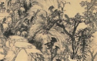 此画画得非常精到。我们看他的山水画,第一个最深的印象就是他的构图强调外轮廓的美,外轮廓线非常整体,非常有节奏。这个外轮廓线画界定了这么一个区域,然后就在这个领域发挥才能,极尽笔墨之能把它填满。第二,他的造型和语言非常统一,用笔都是中锋圆笔或兼带拖笔,和花鸟画的笔法是一致的。再看这组树的节奏,变化非常好。主峰是以披麻皴为主,中锋圆笔,很浑厚。山顶上的点点得非常好,让人感到远山的树一层一层的,画得非常概括、大气。