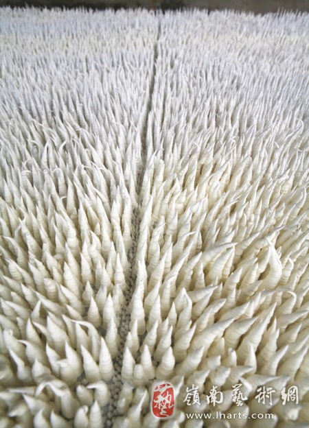 “我有这样的体验,我一旦受到外界环境刺激或心理刺激,全身就会汗毛直立。这是有极端恐惧、紧张而来的心理上的痉挛性和即时防御性,也是由于前面不祥的预兆而造成的一种生命原始本能的生理反应,体内某种腺体分泌出的生物性汁液在这种刺激下于皮肤组织产生一些反应,在皮肤的表层就凸起了密密麻麻的疙瘩。这种行为是不受控制、不可抗的生物原始力量的一种表现,其时间是短暂的,反应是强烈的,直接引导着神经元的信号的输入和输出,暂时加速或暂时中止脑运动,这种反应不仅是个人化的,也是人类普遍性行为,深层上来看也是社会化的。就连猫狗刺猬等低级动物身上也同样存在着这些现象,猫和狗遇到危险时毛发竖立、腰部拱起、身体发硬,刺猬身上的刺平时是匍匐着的(就像是我作品中的兽花皮系列所表现的一样),然而预警时就会根根竖立,锋利无比……除此之外,蕊拉丝钉的观念性还在于对社会矛盾冲突灾难等的承载性上,体现了一种社会机制的预警反应。各种关系下的社会内在的矛盾,就是你针对我的,我针对你的。”