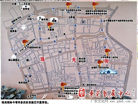 作为中国近现代革命策源地,珠光街辖内的文物建筑举足轻重。中华全国总工会旧址、东园、省港罢工委员会旧址、黄埔军校驻省办事处旧址、中国共产党广东区委委员会旧址、中共两广区委军委旧址以及中国国民党平民教育委员会旧址等等。这里记载了当年国共两党的合作与斗争,位于文德东路文德里的文德楼,就是1926年3月蒋介石制造轰动国人的“中山舰事件”,秘密逮捕李之龙等50余名共产党人的地方,成为“中山舰事件”的重要见证地。