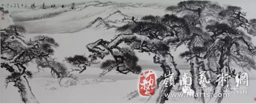 王继良老师是以做学问的心态来把握古人的笔法、墨法、章法,是以意思上、气韵上来作画。世人画松多以山水衬托松树;而王继良老师顺应天然情理,以松树烘托山水,山为母,松为子;母凭子贵,俨然于此;为表现其母之伟健、之博爱、之宽容、之奉献、之无私,采以喻水加以皴染恰如适处,高低秀美,叠嶂起伏,山石嶙峋,泉流石上,日照松间。其松如子,得母抚育,随风繁衍,生生不息,性格迥然,形状各异;有深藏山间、郁郁葱葱、山松交融、为母屏障;有孤立寒秋、奇雄伟岸、高耸如云、气冲霄汉;有铮铮铁骨、迎风斗雪、傲张骨立、千年茂繁;有悬于峭壁、侧挂凌空、百回千转、为世垂范。也只有对松树有这种“山有木兮木有枝,心悦君兮君不知”的真情实感,才能游刃有余的游曳与松海之间,淋漓有致的把对松的敬畏之情跃然纸上,尽显其浩然正气之风骨和百折不回之气质,得自然意趣,亦有君子之德风也。既有笔墨酣畅之意,也有浑厚华彩之章。正是以这种虚实相生、阴阳互补、有因有果的自然意境,才造就了与生俱来的性情。在他的笔墨下,“笔气”和“墨气”具有了不同于其他画作的真气和精神风骨,在平凡的、平淡的、平常的、平正的景致中能让人感到不平,使人感受到“无象无形”的主观挥洒的忘我境界。