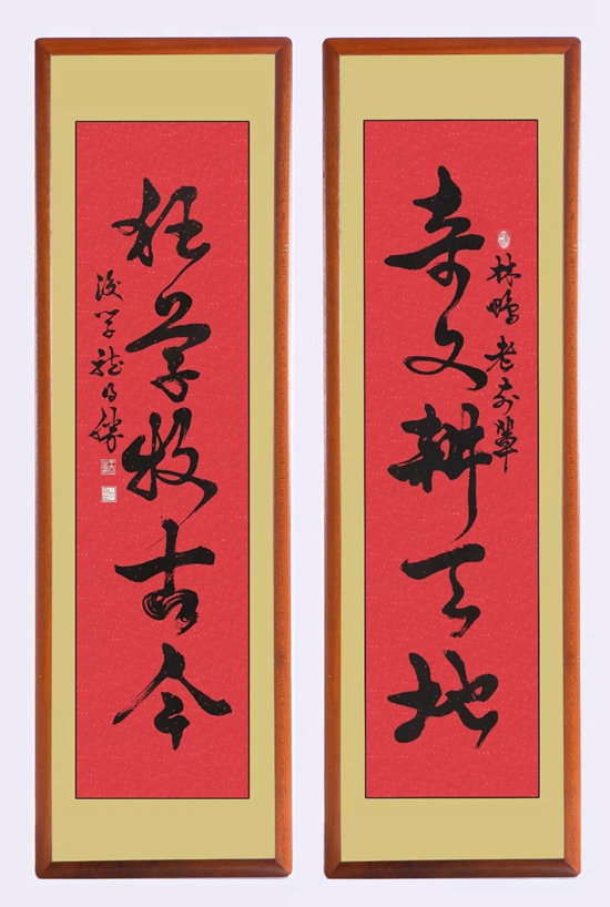 拜见林老是在他的新居,政府在东山新开发的楼盘为搬迁户分配了回迁安置房。谈及东花园的流年往事,先生自然是非常怀念的。但对于迁居一事,却并未因自己失去故园而心存怨怼,反而对政府重视文化遗址保护和恢复古建筑的计划表示欣慰和支持。古人云“学问深时意气平”,的确如此!内在的精神世界越是厚实,越是不太在意身外的物质环境,可谓“心有安顿,不随境迁”。哪里能安放一张书桌半榻书,哪里就是他的“蒙斋”。正因此,先生对他的新宅还是挺满意的。他将“蒙斋”重新布置一番,客堂正中的横幅是刘正成先生手书的“蒙斋万福”,笔力遒健,寓意美好。挂于两侧的一幅装了框的对联,红底黑字,上书“奇文耕天地,狂草牧古今”。记得前些时,随我学书的温星辉和林晓阳(林鹏先生嫡孙)来见我说,林老搬家了,盼为之撰写一幅祝福长寿的联。我就想,人老了,不必总把长寿挂嘴上,活得忘了年岁就是最长之寿。遂为之吟出此联,并照两位年青人的要求书于红纸之上。我自认为这幅对联的寓意是林老的毕生追求,也是他的人生写照。林老是“半生戎马半书生”,从一名小八路做起,解放前一直随军作战,解放后转业到政府部门做了文职工作。由于经过了兵荒马乱的年月,因此更珍惜国泰民安的现世,更珍惜读书写字的时光,始终手不释卷,笔不辄耕。他读经论史观世故,著书立说道人心。如果说《丹崖书论》是他的书学心得的话,那么长篇小说《咸阳宫》应该就是他的史学心得,而《东园公记》则是他经世阅事的社会学心得。如今90多岁高龄了,先生仍青灯黄卷半宵过,兴来小豁有新文。林老一生钟情翰墨,对狂草下功尤勤,焚膏继晷,兀兀经年,于天命之年得悟清人傅青主之笔法,80年代藉狂草而驰名于神州书坛。鹏程不辞远路,大器期于高年,先生孳孳矻矻,青灯不灭,耄耋之岁,衰年变法,狂草艺术于蔚然大观之处再开新境,步入了解衣般礴的自由胜境。林老近日作草 “顾炎武说‘萧然物外,自得天机’吾不如傅青主”,正是其率尔抒怀,藉手写心也。此作笔墨气象,奇正机趣,一派盎然,点画氤氲,无限天真,有睥睨天下,傲视古今之豪迈也。