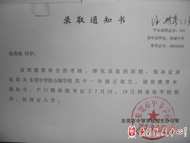 年中考培优班温晓盈、张伟斌、林少洪同学考上东莞中学松山湖学校!