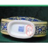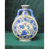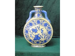 此品羡取南宋官窑之造型,以彰其端庄古雅之优美,外表装饰宣窑黄地青花之釉彩,以撷其苍妍璀璨之华贵。胎釉精良,抚之似玉,笔意细腻,点染深沉,颇获宣青神髓,腹部扁圆,腹中心桃形状凸起,颈部为缠枝如意双耳纹饰,敷设黄彩,匀净明亮,与青花上下辉映。其造型与此等釉彩相配犹如天作之合,两者相得益彰。底部青花留白书写“大清乾隆年制”篆书款,是乾隆官窑传世之难得珍品。