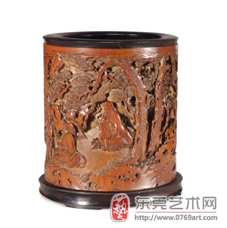 藏品中还有一件雕工精湛的明末竹雕四老图笔筒。在拍卖之前该笔筒就为专家所看好,最后成交价为$842,500,为全场成交价第三。该笔筒图中林荫茂密,奇石环绕,意趣盎然。这件精美的笔筒系出名门,曾是乾隆第十一子成亲王永瑆的收藏,故器底铭有其室名“诒晋斋”。笔筒镶口嵌底,下承三矮足。外壁通景雕四老图。山林中松桐掩映,两老策杖漫步闲聊,其中一老手握灵芝,两老席地对坐,一童子手握系有葫芦的木杖站于一旁,另一童子背伏灵芝站在小桥上,脚下溪水淙淙。一侧山石上刻“吴趋唐寅画”,随“朱”、“稚征”款。底刻“诒晋斋藏”篆书印款。朱稚征,活跃于十七世纪初叶。祖父朱鹤为嘉定派竹雕创始人,活跃于正德、嘉靖年间。他工诗文,善丹青,精篆刻。他运刀如笔,认为凡竹雕,必须用深刻、透雕等对比明显的雕刻技法,才能充分表现出竹雕的深远意味。他和父亲朱缨,不但继承了朱鹤雕刻技法,更把他的技法发扬光大,使艺术造诣更为深湛。他们祖孙三代被称为明末竹雕世家“嘉定三朱”,其雕刻技术最臻绝妙。北京故宫博物院藏一件清初的竹雕狩猎图笔筒,见2002年北京出版《故宫雕刻珍萃》53页,其浮雕刀法精深,于本器颇为相似。