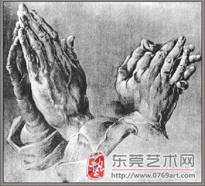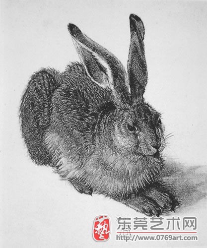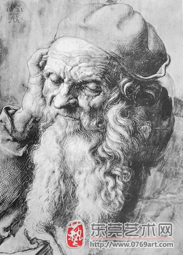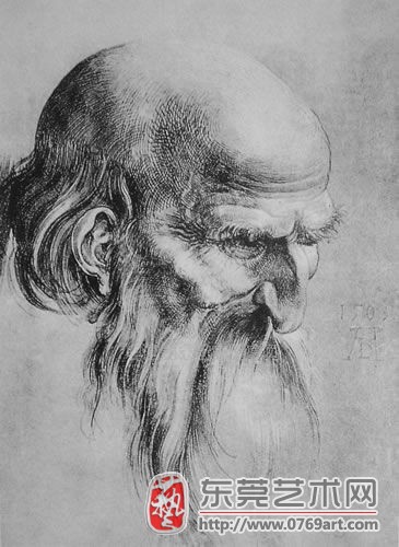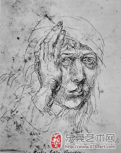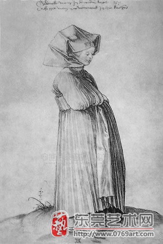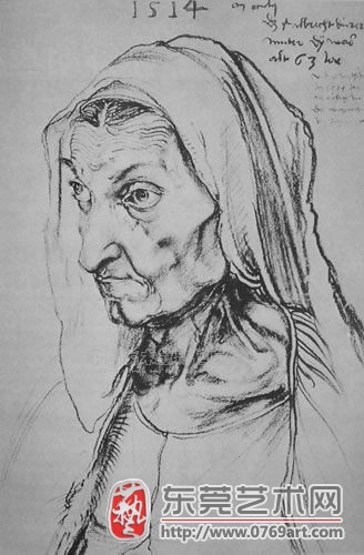当时的绘画还局限于对光影的过度 力求保持实体的真实。丢勒的素描风格:力求忠实对象,笔法细致准,类似铜版画的线条风格源于古典大师丢勒的素描风格。可以看的出他的精致严谨,他的签名很有特点。他出生在德国纽伦堡,当时的德国正处于其历史上最为暗淡的一段时期。思想和信仰的混乱,饥荒和瘟疫(黑死病)无情地夺去大批人的生命,社会矛盾的激化。这使德国的文化与艺术疲弱不振,外于严重的低迷状态。与此同时,以意大利为首的欧洲各国却已经先后走出中世纪,进入了政治、经济和文化的开放与繁荣时期,人文主义的光辉已经照亮欧洲大陆。于是,作为一个德国艺术家,丢勒只能在一个代表着过去的落后国度里苦苦追求和传播着“现代”欧洲的先进思想。他少年时曾追随父亲习艺,他对绘画表现出特殊的才能,13岁时就能逼真的画自己的肖像,19岁时为父亲所画的肖像已充分显示他成熟的素描功力,可与达·芬奇遥相呼应。丢勒具有科学的头脑,因而曾深研数学和透视学并写下了大量笔记和论著,其画的动植物素描之精确完全可以同达芬奇所留下的相媲美。