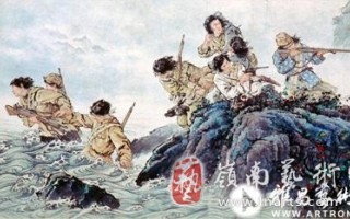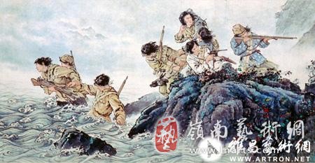 对江边的礁石和江面波浪的描绘,可见其对传统山水画技法的熟练把握,而人物的线条描绘也是运用了传统笔墨勾勒和渲染手法,有所不同的是所表现的是现代人物和战争题材,但仍然符合中国画的审美要求,仍然是用中国画的笔墨去表现现代题材,表现主题创作,或许这正是这幅经典作品的过人之处,也是使得作者王盛烈能成为关东画派的重要开创者,导引关东地区现实主义流派,并举足轻重而影响了几代人成长最直接的原因。