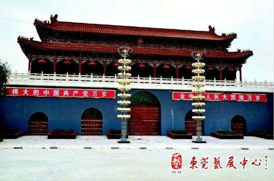 昨日,记者在当地看到了位于岐山县五丈原镇的这座三层仿古建筑,红墙黄瓦、飞檐彩绘。据了解,岐山县五丈原镇街道建的这座“城楼”,是当地一家企业为自己工厂重修的东大门。该城楼高33米,宽45米,一楼设置为该企业礼堂和大门,在二楼设置的是企业接待和办公的地方。基座为城墙,青砖装饰,二楼有汉白玉的围栏。从外部看,城墙上呈两层城楼结构,十根大红立柱竖立在二楼的屋檐下,在三楼屋檐中间悬挂有诸葛亮的一个头像,屋顶四角金色的飞檐上各有五个朝天吼,屋顶的黄色琉璃瓦在阳光中十分抢眼。有群众认为一个企业仿照“天安门”来建设企业大门有失庄重。