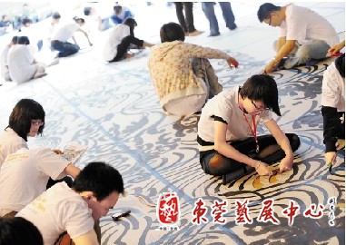 随着蔡国强的一声令下,志愿者们又纷纷拿出美工刀,刹那间寒光闪闪,他们沿着墨线一刀刀地将《雷峰塔》、《小百花》等图纸镂空,塔和女性人物的形象渐渐生动起来。另一部分负责压纸板的志愿者干脆就坐在上面,用身体的重量来回滑动。