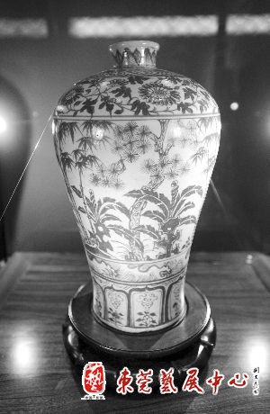 朝天宫最出名的瓷器要数“萧何月下追韩信”青花梅瓶,它早已被定级为“国宝”了。这次“玉堂佳器”展厅内,“萧何月下追韩信”青花梅瓶的邻居釉里红“岁寒三友图”梅瓶也晋级了。