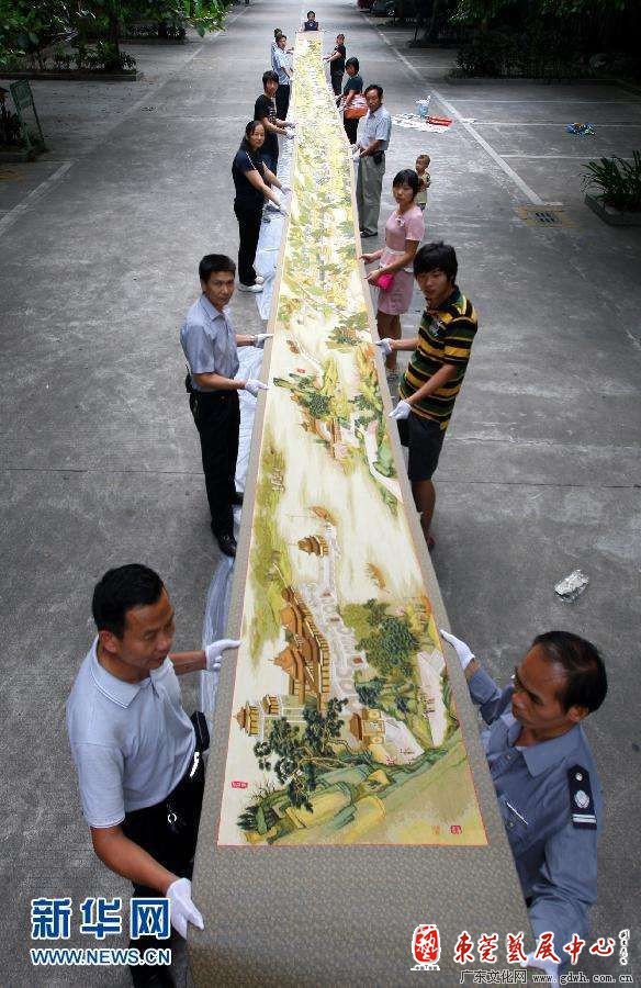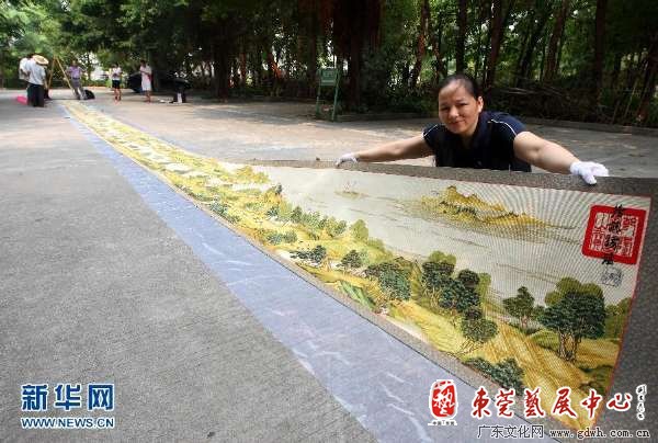 这幅十字绣《清明上河图》画面全长22米,宽0.75米,共绣了11万多针,由在东莞打工的曾雪军从2008年2月开始创作,历时3年多完成。