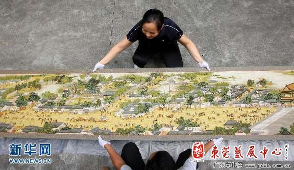 9月19日,在广东省东莞市洪梅镇,人们在展示曾雪军创作的十字绣作品《清明上河图》。