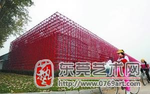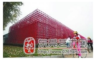 从北六环火寺路出口出来,就能看到“寺上美术馆”的指示牌。顺着指示牌向北不到一公里,一片耀眼的红色脚手架便映入眼帘,这可不是未完工的工地,而是中央美术学院雕塑系主任隋建国的一件雕塑作品,名曰“94度8”(图)。这个名字取自雕塑背后的寺上美术馆大门口与火寺路夹角的角度。