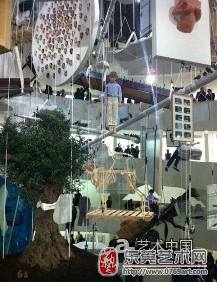 而最贴近地面的作品可以说是卡特兰最为著名的雕塑了,即是饱受争议的“第九小时”,蜡和树脂制作的教皇保罗二世雕塑被一块从天而降的陨石击倒在地,作品以一种难以言状愤怒和傲慢的焦虑打破了他的神圣。这件作品绝对值得仔细观看,很难得的机会可以一睹教皇被来自外太空的神奇讯号给击倒后脸上自然流露的情绪。某种程度上看来,这正是“全部ALL"展的一种隐喻的说法,打造出了一种不可思议且难以言说的意境。