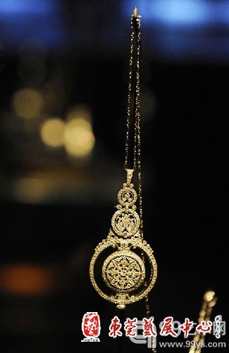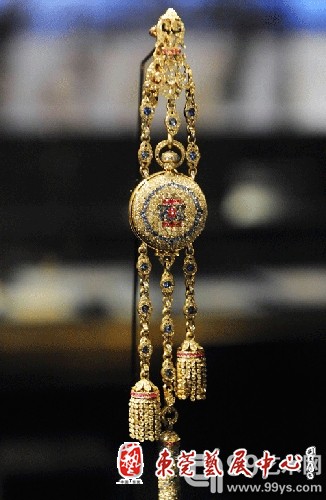 (6)这是1853年制造的项链表。这枚项链表及表链以黄金、银、鸡血石、红宝石、钻石与细粒珍珠装饰。
