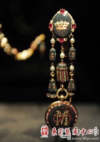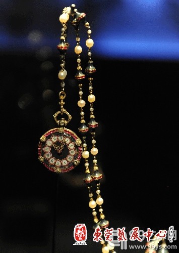 (5)这是1850年制造的链饰表,这枚链饰表以鸡血石、红宝石、钻石与天然珍珠来装饰,使用时佩戴在腰带的链子上。
