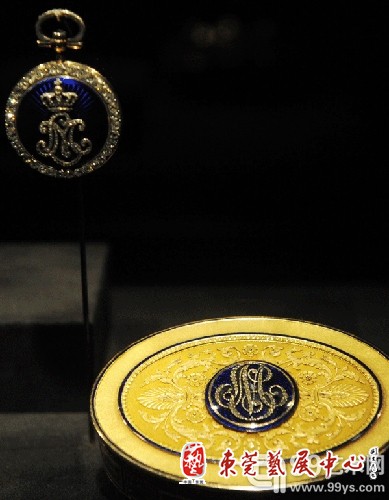 (4)这是1813年为玛丽路易丝皇后制造的挂链怀表。此枚圆形怀表以蓝色珐琅制成,表壳边沿镶满美钻,中央缀以玛丽路易丝皇后独有的徽号。