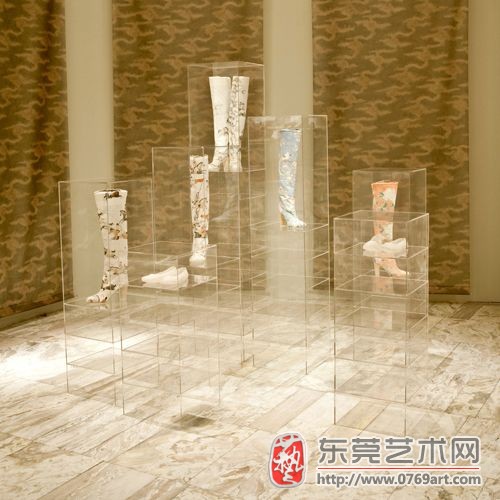 在连卡佛一层的画廊区,首先映入眼帘的是彭薇以女鞋Sergio Rossi为创作载体而制作的名为《好事成双》的水墨画鞋履作品。她利用了传统水墨画的题材与样式,通过细致精美的水墨描绘和Serigio Rossi鞋履现成品的媒介,实验性地对传统水墨画给予的一种后现代的挪用、移植和穿越。在这里,也呈现了她的创作从平面的图式、逐渐延伸到与空间内外转换的不同关系上的结果。因此,这些作品不仅充满中国传统的女性美,也蕴含着其艺术在承载传统上的“金蝉脱壳”和谨细、寓情的空灵感受。