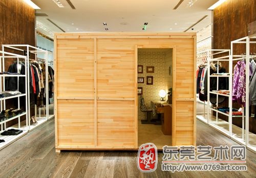 而最后一位艺术家陈可的作品《5.76平米》是一个木头的小房子,处于连卡佛三层众多时髦大牌之间的虚拟生活空间乍一看与陈可之前的标志性卡通风格截然不同。仔细一看,小屋的桌布,墙纸以及床单全部出现了陈可典型作品中那个圆鼻头的小女孩。陈可通过手绘的方式把绘画作品变为家居用品上的图案,打破了艺术品和日常生活的藩篱。通过这种方式传达出一种概念:艺术就是通过种种方式让周围的世界更适合自己,无论是浩瀚宇宙还是5.76平米的小屋。