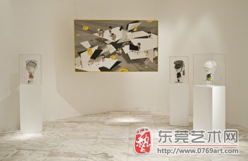 同样在这个区域展出的还有韩娅娟的油画和雕塑作品《Jamais Vu》。韩娅娟试图用一种超越现实的视角观察和表现这些物理性的“物质”存在。通过对显像的物质形式在高、多维空间视角中的各种猜测和遐想的描绘使现实变得是似而非,从而呈现出人与客体同质化的效果。她的作品中可爱的女主人公在这里也同时以三维雕塑的形式出现,主客同体的她,在不同空间中延续着对现实一半是沉溺,一半是超然的态度。