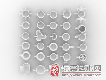 每一个杯子都是向平铺的陶瓷材料粉末上特定部位喷洒(打印)结合剂,然后取出、清洁、烧结制成的。其中“打印”的过程约需要四小时。下面是其中的一些杯子,请您欣赏。