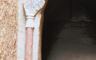 壁画墓位于统万城遗址南约4公里处八大梁墓地,去掉门口的封门砖后,仿佛来到北魏石窟的门口,土上雕刻立柱、拱形门,并施以彩绘。和其他墓葬门明显不同的,是这个墓门的仿石窟门造型。