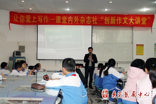 讲座邀请了《课堂内外》杂志的首席记者、《创新作文》执行主编、全国创新作文大赛评审郑幼童先生主讲。郑先生就作文的创新思路作了深入浅出的讲授。他借助现场多媒体手段,传授系统、专业写作技巧,并启发学生的思维和想象空间。他的语言生动,引人入胜,有效调动了学生的写作兴趣。学生们争先发言,互动热烈。