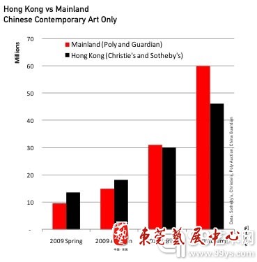 ArtTactic指出,中国在去年首次超过英国成为世界第二大艺术市场。ArtTactic去年的图表显示,中国国内艺术拍卖市场销售惊人地上升了271%,并有史以来超过香港佳士得和苏富比销售总量19%。报告指出中国大陆买家和香港买家的鉴赏口味是不同的。去年,当代题材和概念实践的艺术品占香港拍卖市场的64%,相比之下,57%的大陆拍品更具有传统风格。